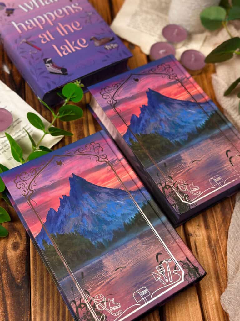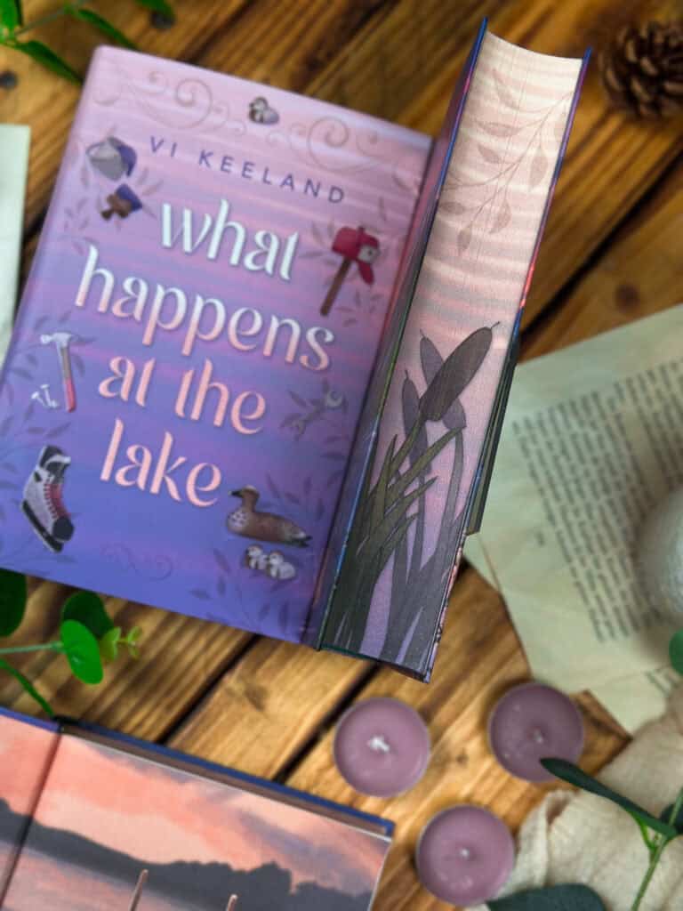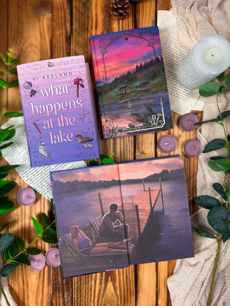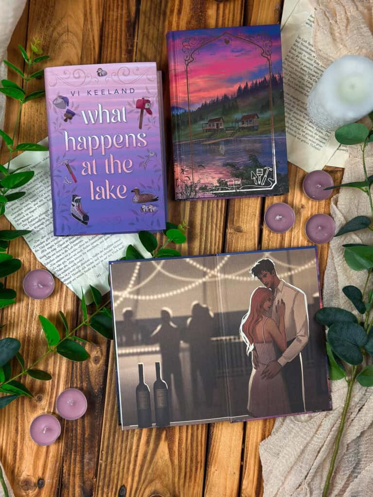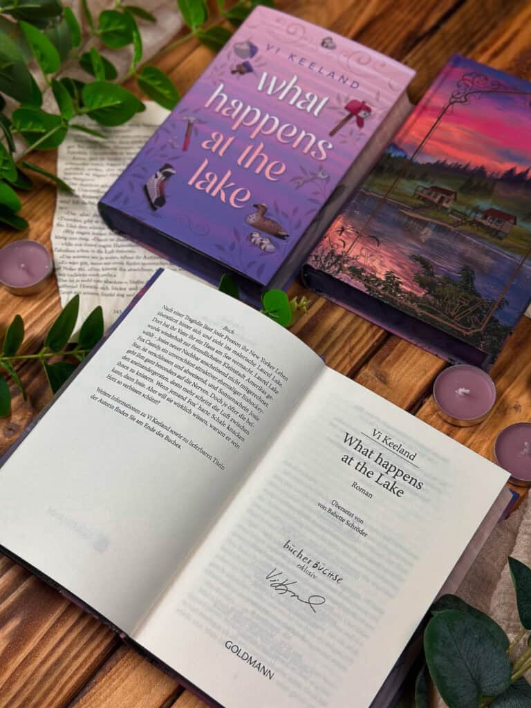 WHAT HAPPENS AT THE LAKE von Vi Keeland als exklusives Hardcover mit Schutzumschlag mit einem neuen Cover designed von @cover.up.books, einem exklusiven Bezug designed von @vitkovskaya_art, einem exklusiven Vor- und Nachsatz designed von @avendellart, einem exklusiven digitalen Farbschnitt designed von @cover.up.books sowie einer eingedruckten Signatur der Autorin.