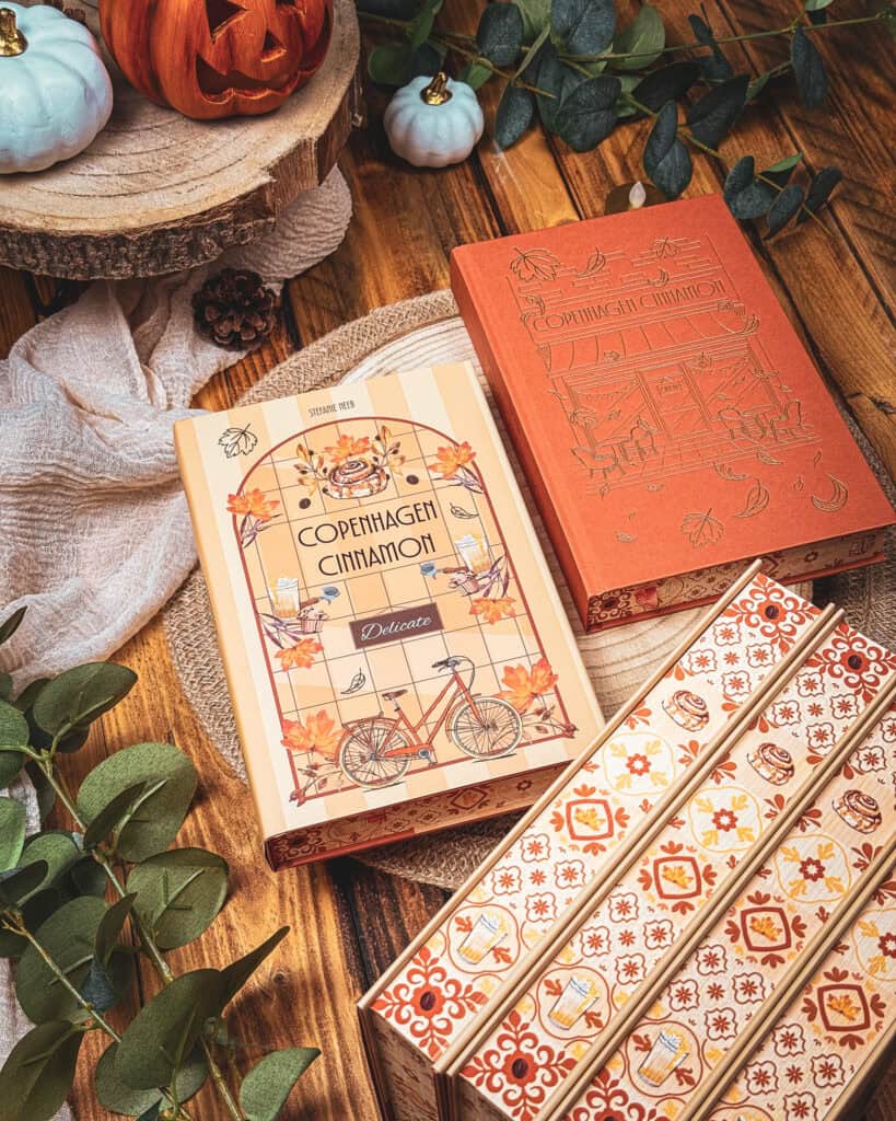 - COPENHAGEN CINNAMON – DELICATE von Stefanie Neeb als Hardcover Exklusivausgabe mit einem exklusiven neuen Cover, Innenumschlag und Farbschnitt gestaltet von @solaires.stories, einer exklusiven Prägung gestaltet von @caroline.dsign, einem exklusiven Vorsatz von @zips.design sowie einem exklusiven Nachsatz gestaltet von @kalisdice