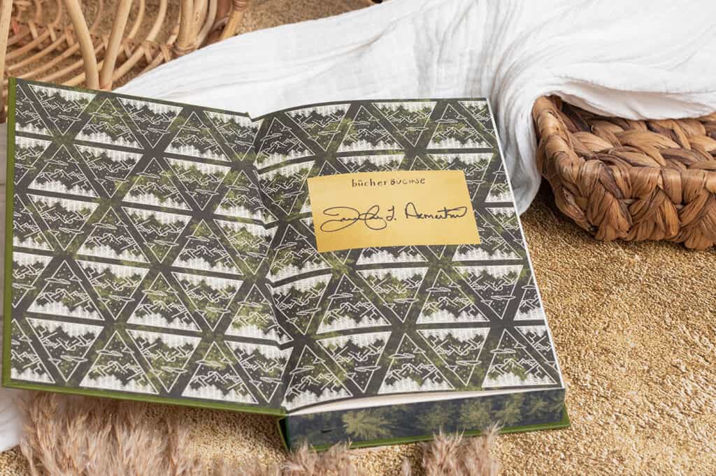 Alle Bücher erhalten einen individuell gestalteten Vor- und Nachsatz passend zu dem jeweiligen Element designed von @solaires.stories