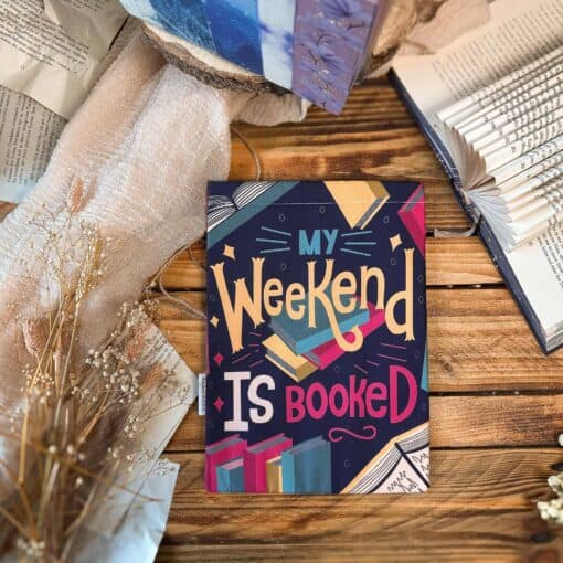 Buchhülle "My weekend is booked" designed von @abbymalagaart, beidseitig bedruckt