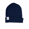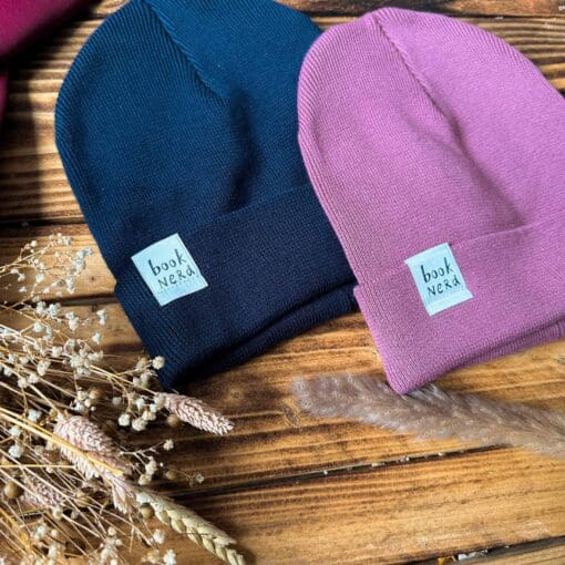 Eine Rib-Beanie in unterschiedlichen Farben mit einem "Booknerd" Label.